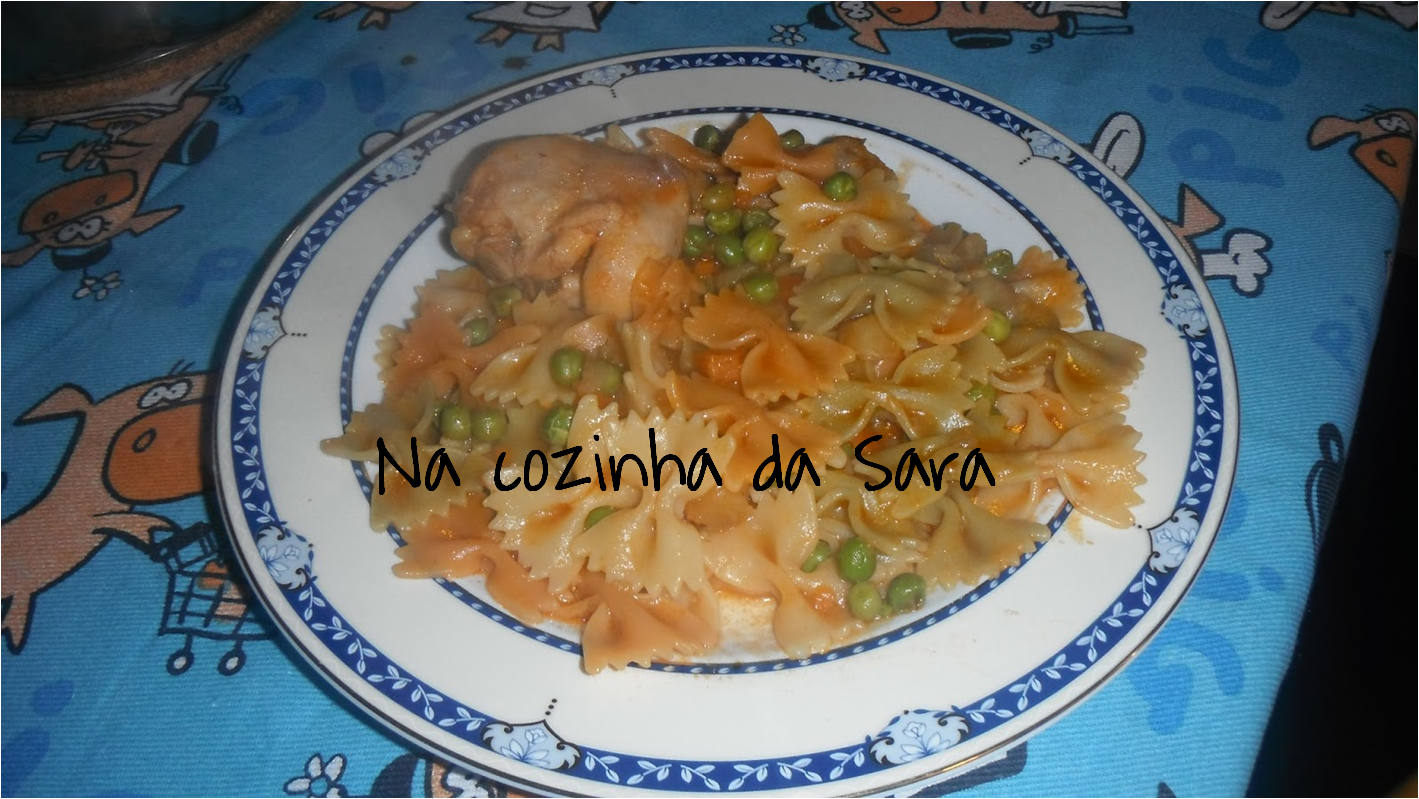 Pique a cebola finamente e corte a cenoura em cubos pequenos e leve a alourar num tacho num pouco de azeite. Junte o caldo de galinha esfarelado e as coxas de frango previamente temperadas com sal. Adicione a polpa de tomate, a cerveja e uma caneca de água. Deixe cozinhar durante cerca de 15/20 min, adicionando água sempre que necessário (não cubra as coxas com água, mantenha só o suficiente para não torrar). Adicione água suficiente para cobrir as coxas e a massa. Junte a massa e as ervilhas e deixe cozer entre 12 a 15 minutos.