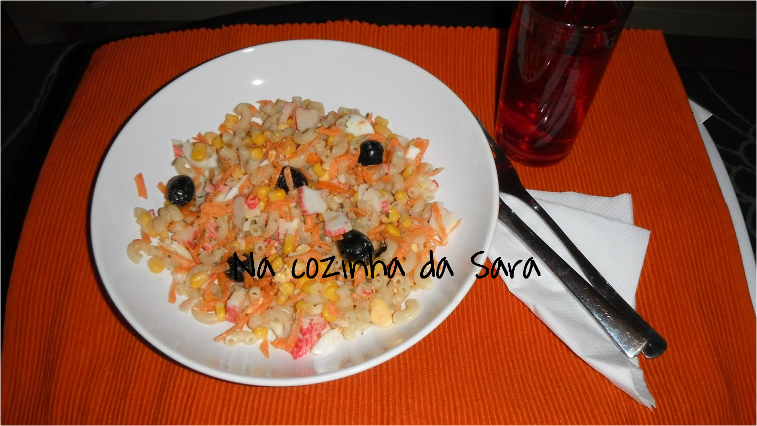 Descasquei meia cenoura, passei-a num ralador e coloquei-a num recipiente, onde juntei também o milho, as delícias cortadas em rodelas. Juntei a massa, o ovo cozido cortado em rodelas, um fio de azeite, orégãos e azeitonas. Misturei bem e voilá!