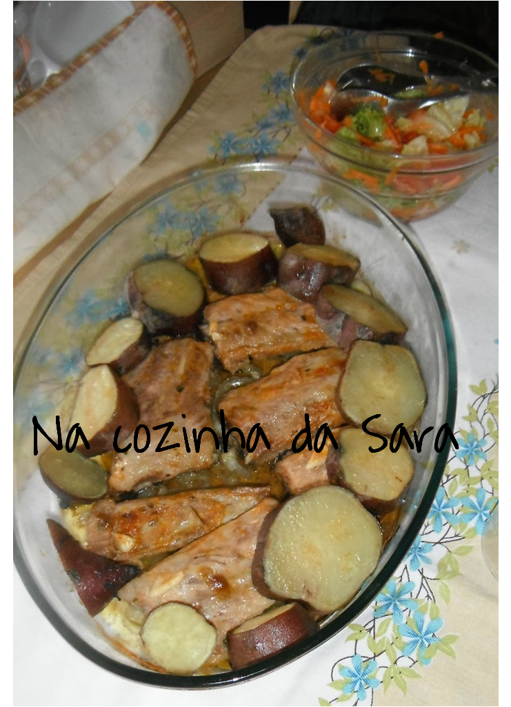 No fundo de uma assadeira coloquei um pouco de azeite e por cima uma cebola cortada em rodelas. Por cima coloquei as costelinhas e a batata doce. Cobri com um fio de azeite e levei ao forno cerca de 20 min. até as costelinhas ficarem bem cozinhadas e douradinhas.