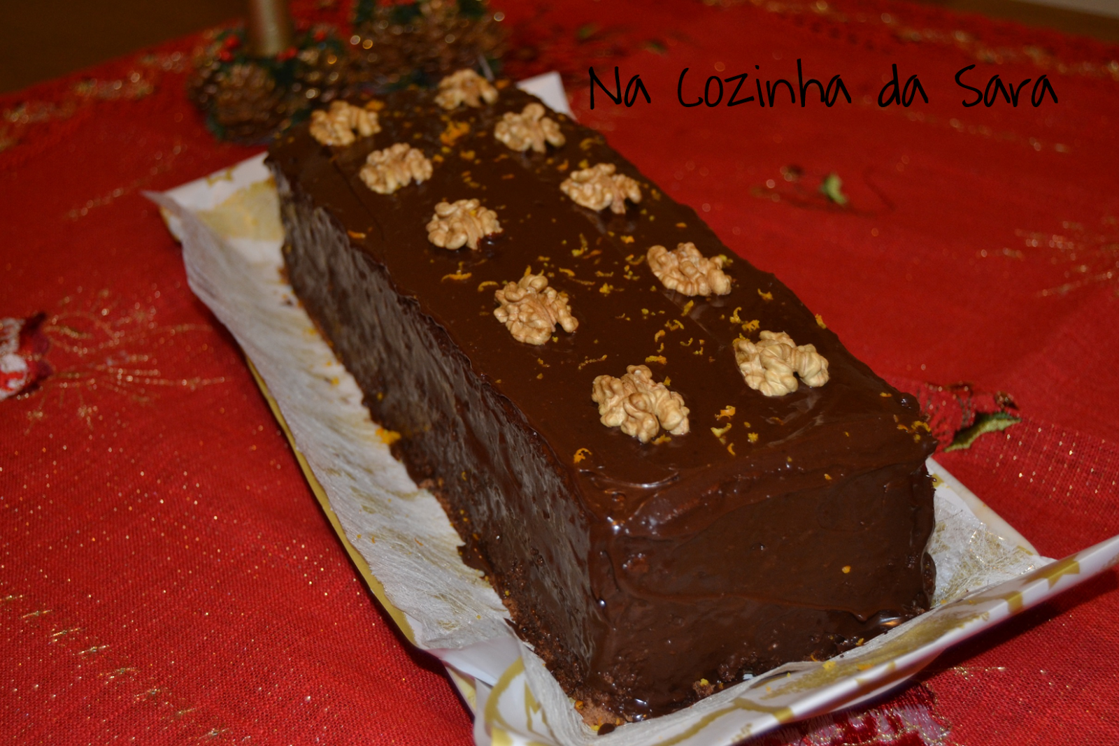 Desenforme o bolo e deixe arrefecer. Apare as extremidades e corte-o em dois retângulos iguais. Cubra uma das partes do bolo com o chocolate e um pouco de raspa de laranja, coloque a outra parte do bolo e cubra com a restante cobertura de chocolate. Termine com raspa de laranja e as metades de noz.