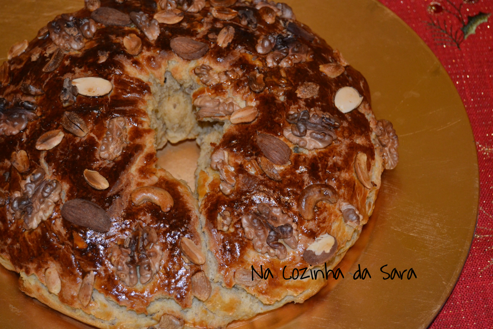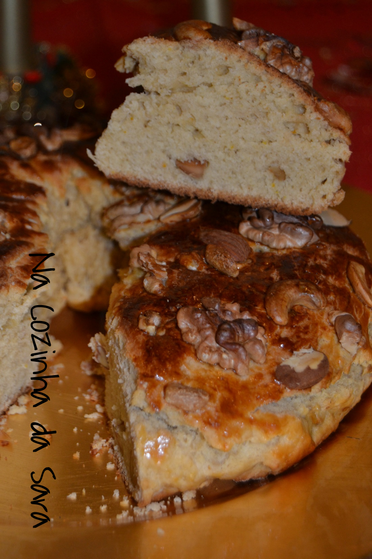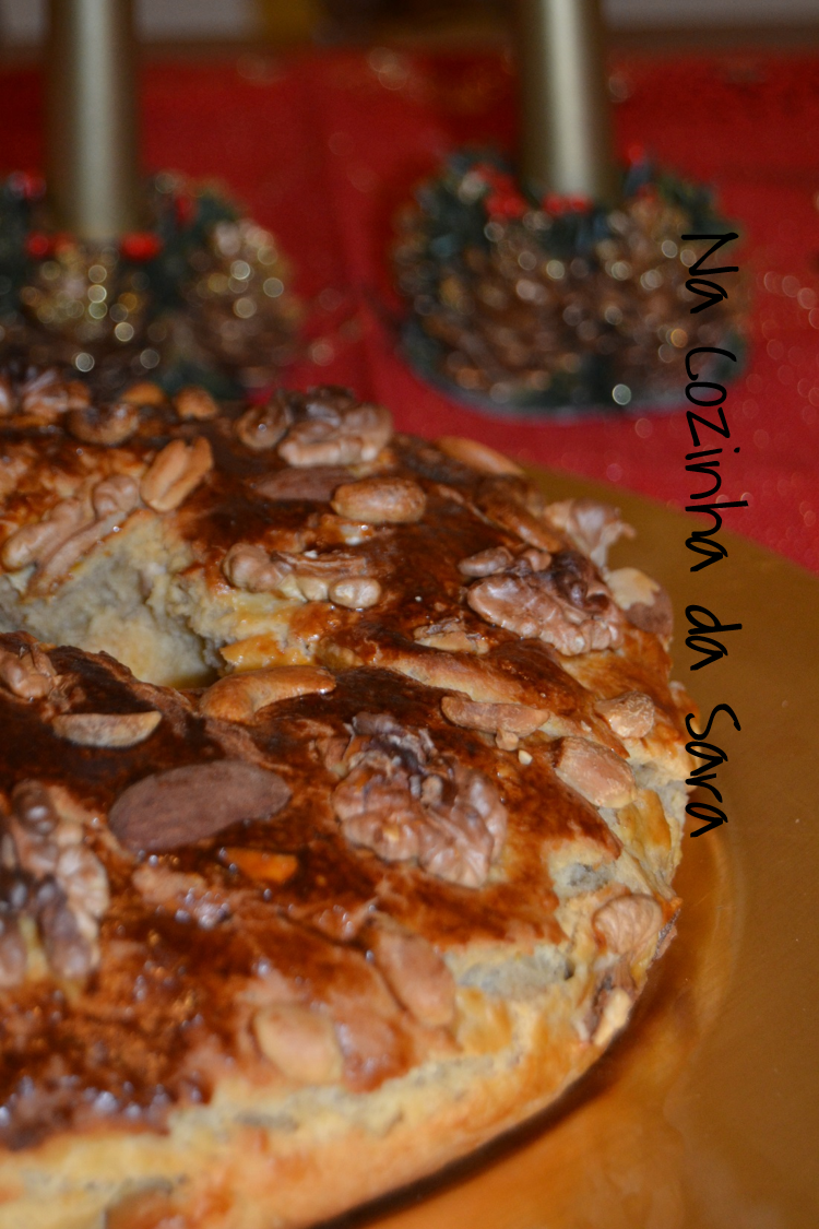 Para o Rapinanço Natalício, tema da edição do Dia Um... Na Cozinha de Janeiro, que consistia em confecionar uma receita alusiva ao Natal ou Ano Novo de um dos membros do grupo, escolhi esta Coroa de Frutos Secos da querida Alexandra da página Jovens Donas de Casa. Adoro a sua página, sempre repleta de delícias, sendo esta Coroa a que mais me chamou atenção. Fiz pequenas alterações à receita, pois não tinha aguardente e dispenso a gila, mas coloco a receita original abaixo. Deixo aqui também o link para a receita.