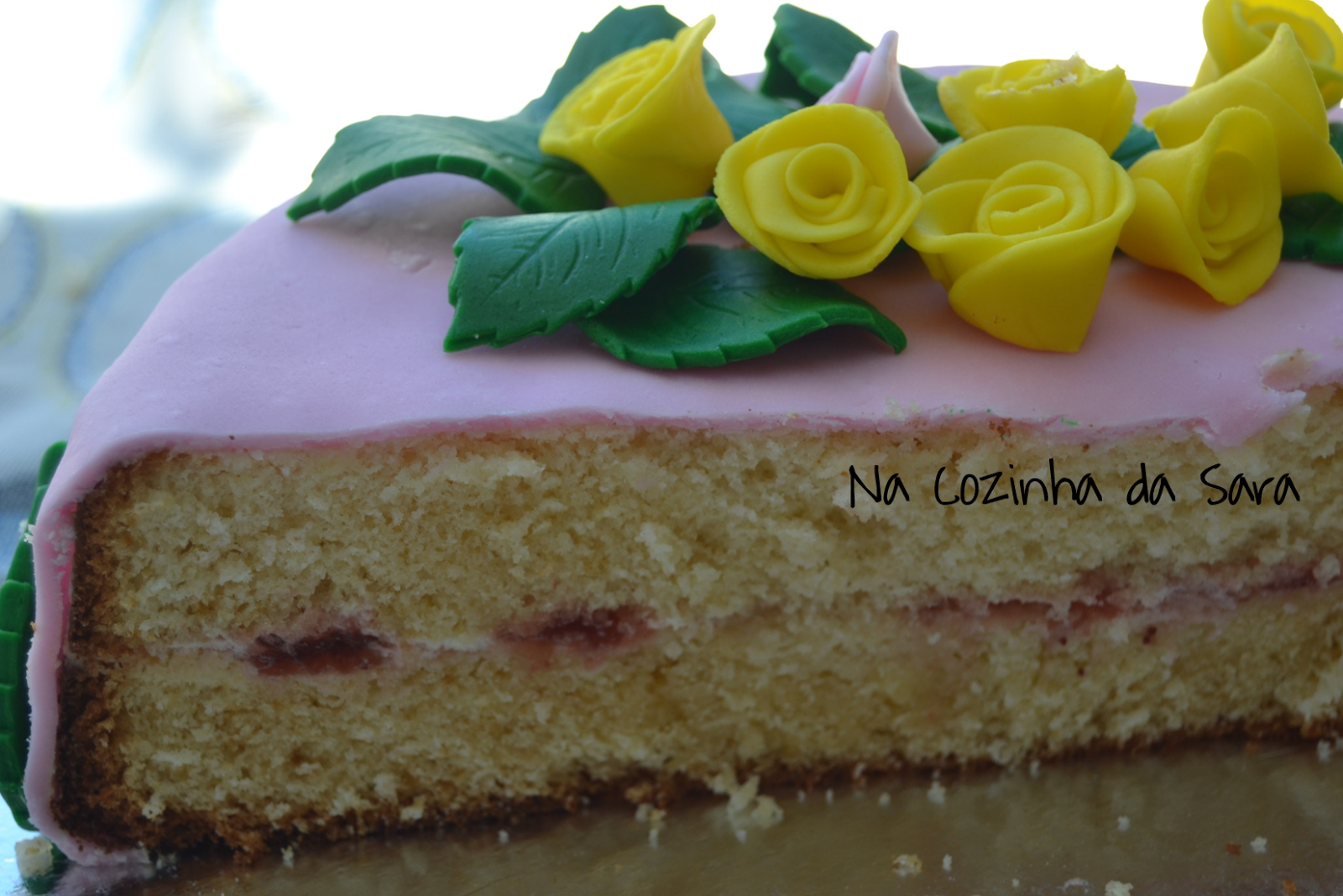 Barre uma das camadas com o chantilly e cubra-o com algumas colheradas de doce de morango. Cubra com a segunda camada. Barre o bolo inteiro com uma fina camada de chantilly e cubra com pasta de açúcar. Decore a gosto.